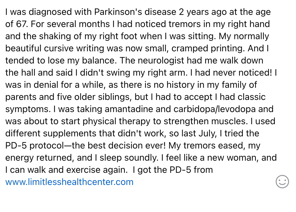 I was diagnosed with Parkinson’s disease four years ago. For over two years, I relied on Levodopa and several other medications, but unfortunately, the symptoms kept getting worse. The tremors became more noticeable, and my balance and mobility started to decline quickly. Last year, out of desperation and hope, I decided to try a herbal treatment program from NaturePath Herbal Clinic.